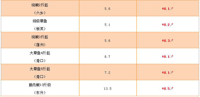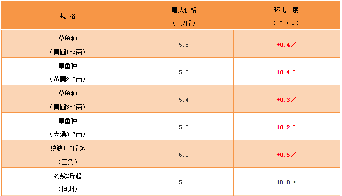 文/ 水產前沿 何鴻浩 中國水產頻道原創報道,草魚種:本周草魚種價格持續上漲,受統鯇、大草魚、脆肉鯇行情拉動以及外省魚車增多的利好因素,養殖戶出魚理性,走量明顯,預計存塘量逐步降低后行情將持續向好。 統鯇:由于市場魚大量減少,價格快速上漲,1.5斤規格上漲0.5元/斤,報價為6.0元/斤;2斤上規格上漲0.1-0.2元/斤,5.1-5.6元/斤;3斤上規格上漲0.3元/斤,報價為5.6元/斤。 大草魚:價格上漲0.1元/斤,4斤上規格為67元/斤;5斤上規格為7.2元/斤。 脆肉鯇:本周脆肉鯇價格上漲0.5元/斤,近期冷空氣頻繁,市場需求大,養殖戶惜售,導致市場供不應求。而且,今年脆肉皖養殖量少于往年,預計隨著天氣進一步轉涼,春節前價格還會有機會上漲。 |