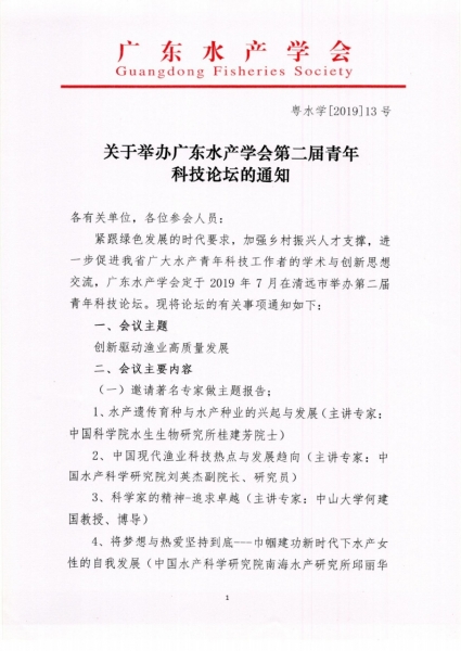 緊跟綠色發展的時代要求,加強鄉村振興人才支撐,進一步促進我省廣大水產青年科技工作者的學術與創新思想交流,廣東水產學會定于2019年7月在清遠市舉辦第二屆青年科技論壇。現將論壇的有關事項通知如下: