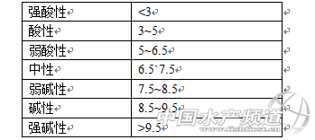 養殖水體pH值是水質的重要指標,對魚和蝦的高產穩產具有重要作用,必須十分注重養殖水體pH值得管理。通常將養殖水體pH制作如下分化: